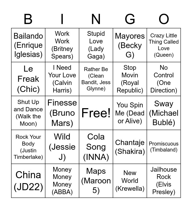 This bingo card has a free space and 24 words: Wild (Jessie J), Money Money Money (ABBA), Rather Be (Clean Bandit, Jess Glynne), China (JD22), Crazy Little Thing Called Love (Queen), Bailando (Enrique Iglesias), Le Freak (Chic), Work Work (Britney Spears), You Spin Me (Dead or Alive), Cola Song (INNA), Stop Movin (Royal Republic), Shut Up and Dance (Walk the Moon), Chantaje (Shakira), Promiscuous (Timbaland), I Need Your Love (Calvin Harris), New World (Krewella), Sway (Michael Bublé), Stupid Love (Lady Gaga), No Control (One Direction), Finesse (Bruno Mars), Jailhouse Rock (Elvis Presley), Rock Your Body (Justin Timberlake), Mayores (Becky G) and Maps (Maroon 5).
