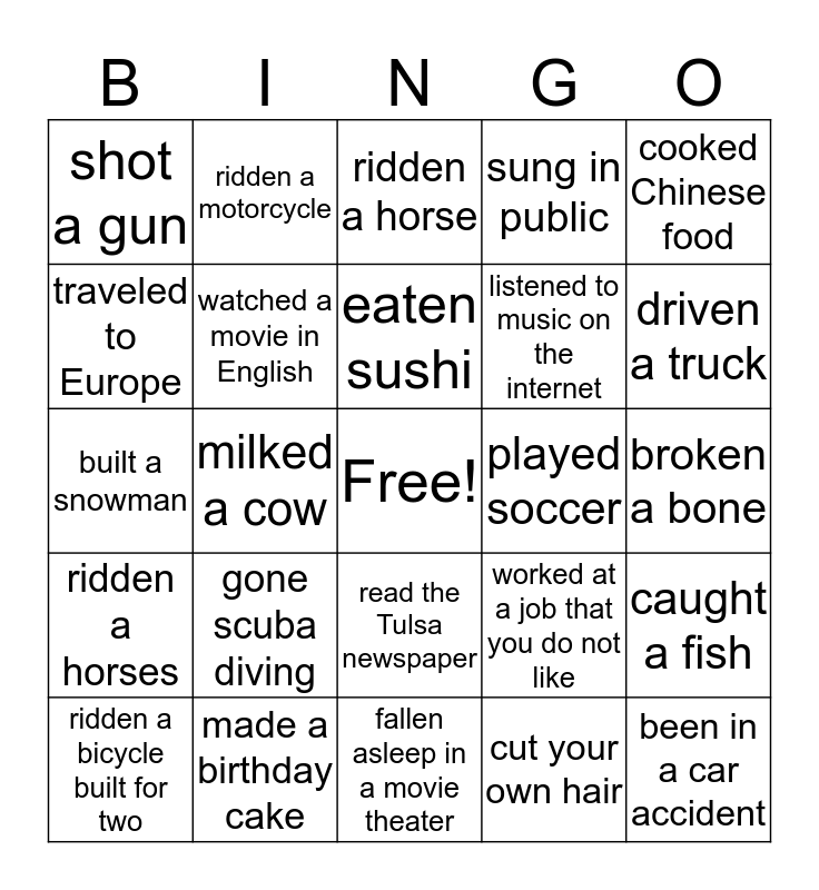 This bingo card has a free space and 24 words: gone scuba diving, made a birthday cake, eaten sushi, ridden a bicycle built for two, cooked Chinese food, shot a gun, traveled to Europe, ridden a motorcycle, played soccer, read the Tulsa newspaper, listened to music on the internet, built a snowman, worked at a job that you do not like, caught a fish, watched a movie in English, cut your own hair, broken a bone, ridden a horse, driven a truck, milked a cow, been in a car accident, ridden a horses, sung in public and fallen asleep in a movie theater.