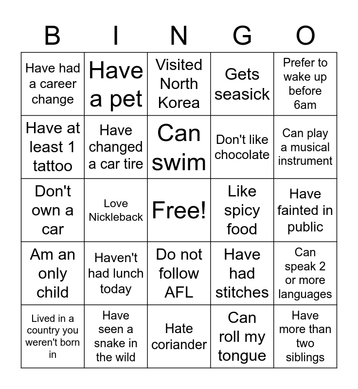 This bingo card has a free space and 29 words: Lived in a country you weren't born in, Have skydived, Love Nickleback, Worked at Lifeblood for 5+ years, Have had a career change, Visited North Korea, Have changed a car tire, Haven't had lunch today, Like spicy food, Have seen a snake in the wild, Have fainted in public, Have more than two siblings, Hate coriander, Can roll my tongue, Can play a musical instrument, Have had coffee today, Do not follow AFL, Am an only child, Prefer to wake up before 6am, Don't own a car, Have had stitches, Know what NSFW stands for, Don't like chocolate, Have at least 1 tattoo, Gets seasick, Have a pet, Can speak 2 or more languages, Can swim and Won a competition.