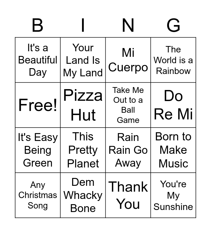 This bingo card has 16 words: Dem Whacky Bone, Born to Make Music, Mi Cuerpo, It's a Beautiful Day, It's Easy Being Green, Your Land Is My Land, Rain Rain Go Away, Thank You, Free!, Pizza Hut, Any Christmas Song, The World is a Rainbow, This Pretty Planet, Do Re Mi, Take Me Out to a Ball Game and You're My Sunshine.