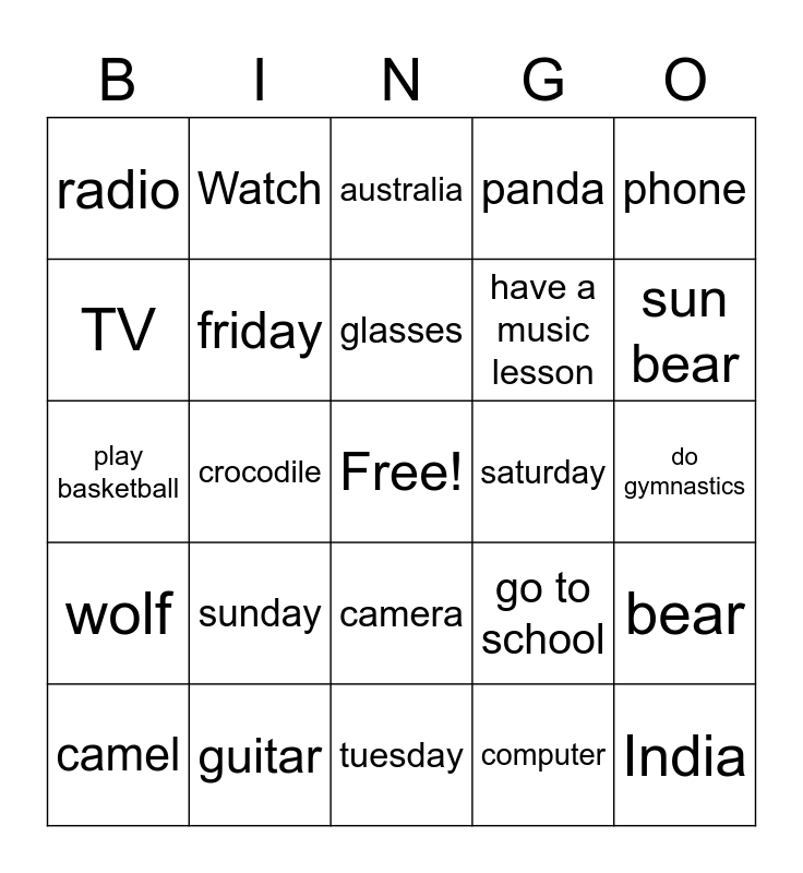 This bingo card has a free space and 26 words: camera, computer, glasses, guitar, phone, radio, TV, Watch, do gymnastics, go to school, have a music lesson, play basketball, bear, camel, crocodile, kangaroo, panda, wolf, australia, India, sun bear, tuesday, saturday, sunday, friday and monday.