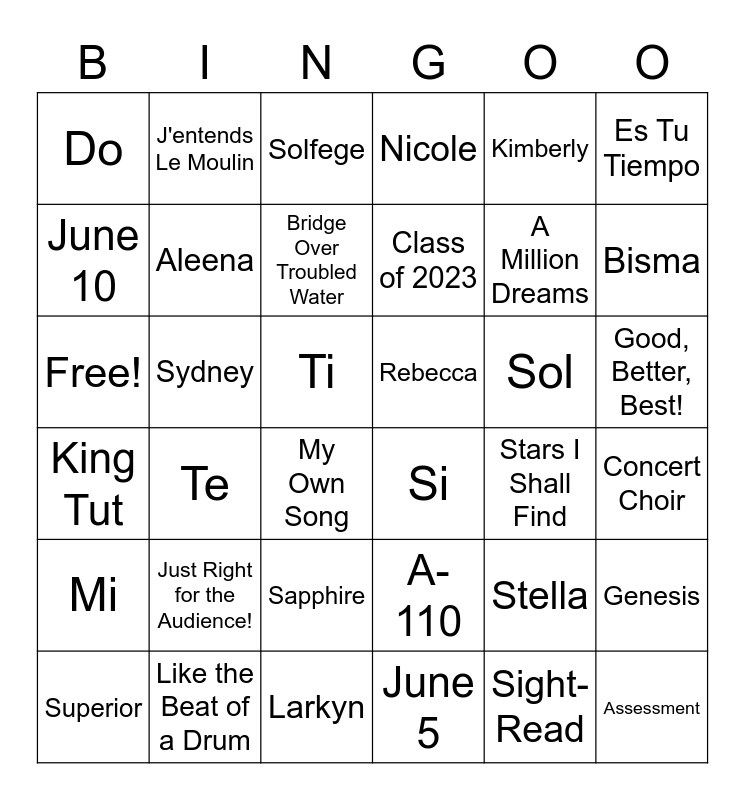 This bingo card has 36 words: A-110, Sapphire, June 5, June 10, King Tut, Rebecca, Aleena, Larkyn, Kimberly, Stella, Bisma, Nicole, Genesis, Sydney, Class of 2023, Do, Mi, Sol, Free!, Solfege, Ti, Te, Si, My Own Song, Stars I Shall Find, J'entends Le Moulin, A Million Dreams, Like the Beat of a Drum, Bridge Over Troubled Water, Es Tu Tiempo, Assessment, Superior, Concert Choir, Good, Better, Best!, Just Right for the Audience! and Sight-Read.