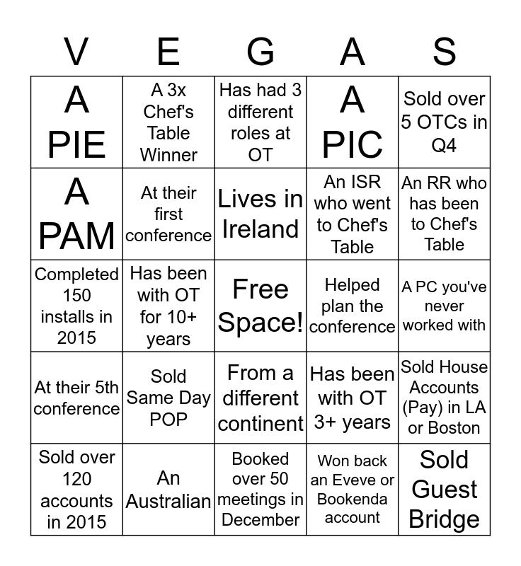 This bingo card has a free space and 24 words: Sold Same Day POP, An Australian, Lives in Ireland, Sold over 120 accounts in 2015, Sold over 5 OTCs in Q4, A PIE, A PAM, A 3x Chef's Table Winner, Helped plan the conference, From a different continent, An ISR who went to Chef's Table, Completed 150 installs in 2015, Has been with OT 3+ years, Sold House Accounts (Pay) in LA or Boston, At their first conference, Won back an Eveve or Bookenda account, A PC you've never worked with, Has had 3 different roles at OT, An RR who has been to Chef's Table, Has been with OT for 10+ years, Sold Guest Bridge, At their 5th conference, A PIC and Booked over 50 meetings in December.