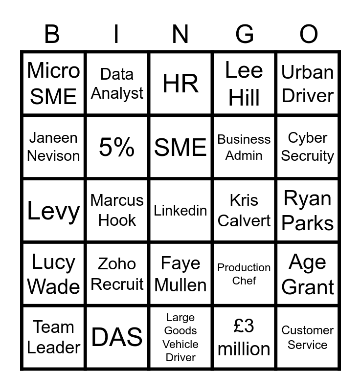 This bingo card has 40 words: Tony Marshall, Levy, Indeed, 5%, DAS, Faye Mullen, SME, Interview, Urban Driver, Lucy Wade, Marcus Hook, Lee Hill, Linkedin, Ryan Parks, Kris Calvert, Zoho Recruit, Chris Grieveson, Micro SME, Recruitment, HR, Age Grant, £3 million, Business Admin, Janeen Nevison, Housing and Property Management, Warehousing, Commis Chef, Data Tech, Customer Service, Content Creator, Business Analyst, Team Leader, Operations, Production Chef, Cyber Secruity, Large Goods Vehicle Driver, Software Developer, Digital Support Technician, Data Analyst and Digital Marketing.