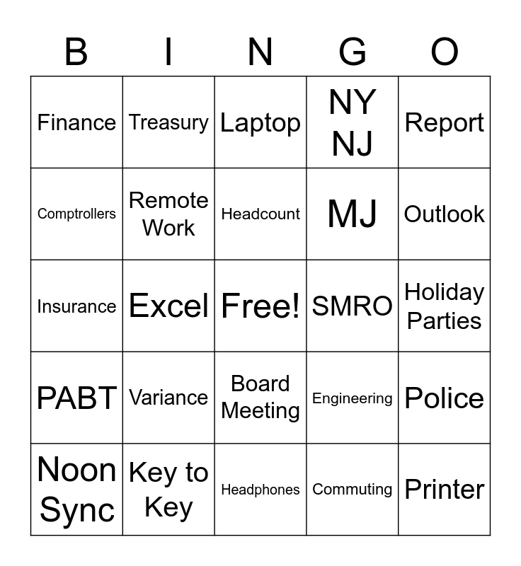 This bingo card has a free space and 24 words: Variance, Key to Key, Headcount, Noon Sync, Report, Finance, Comptrollers, Treasury, SMRO, Board Meeting, MJ, Insurance, Engineering, Police, Remote Work, Commuting, Holiday Parties, Laptop, Outlook, Excel, Printer, PABT, NY NJ and Headphones.