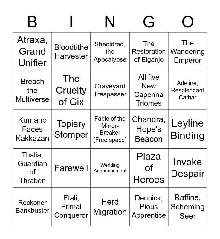 This bingo card has a free space and 24 words: Reckoner Bankbuster, Farewell, Graveyard Trespasser, Dennick, Pious Apprentice, The Wandering Emperor, Atraxa, Grand Unifier, Bloodtithe Harvester, Sheoldred, the Apocalypse, Chandra, Hope's Beacon, Leyline Binding, Kumano Faces Kakkazan, The Cruelty of Gix, Plaza of Heroes, Invoke Despair, Breach the Multiverse, Etali, Primal Conqueror, Herd Migration, The Restoration of Eiganjo, Adeline, Resplendant Cathar, Thalia, Guardian of Thraben, Topiary Stomper, Wedding Announcement, All five New Capenna Triomes and Raffine, Scheming Seer.