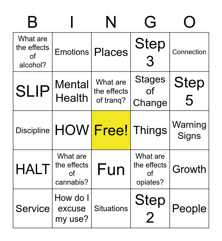 This bingo card has a free space and 44 words: Step 1, People, Be Smart, Not Strong, Service, Which withdrawals can be fatal?, Step 2, Places, Thought Stopping, Connection, How do I excuse my use?, Step 3, Things, Fun, What are the effects of cannabis?, Step 4, Situations, Compliment, Discipline, What are the effects of meth?, Step 5, Emotions, Gratitude, Humility, What are the effects of alcohol?, Serenity Prayer, Warning Signs, Acknowledge, Progress, What are the effects of opiates?, HALT, Complacency, Growth, Goals, What are the effects of benzos?, HOW, Pride, Honesty, Physical Health, What are the effects of tranq?, SLIP, Stages of Change, Letting Go, Mental Health and What are the effects of smoking?.