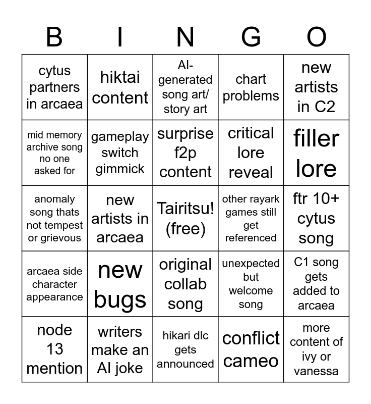 This bingo card has a free space and 24 words: new bugs, writers make an AI joke, surprise f2p content, node 13 mention, new artists in C2, cytus partners in arcaea, mid memory archive song no one asked for, hiktai content, other rayark games still get referenced, original collab song, critical lore reveal, anomaly song thats not tempest or grievous, unexpected but welcome song, C1 song gets added to arcaea, gameplay switch gimmick, conflict cameo, ftr 10+ cytus song, AI-generated song art/ story art, filler lore, new artists in arcaea, more content of ivy or vanessa, arcaea side character appearance, chart problems and hikari dlc gets announced.