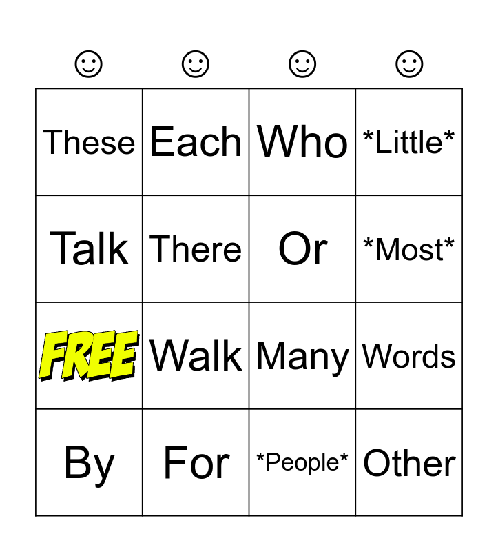 This bingo card has 1 images and 19 words: Words, Which, Who, Then, By, Talk, For, These, Each, Walk, Many, There, Other, Or, Will, *Most*, *Little*, *People* and *Use*.
