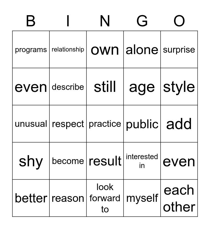 This bingo card has a free space and 25 words: become, look forward to, still, better, surprise, programs, even, relationship, public, result, age, unusual, interested in, even, describe, basic, add, own, style, respect, each other, reason, shy, alone and myself.