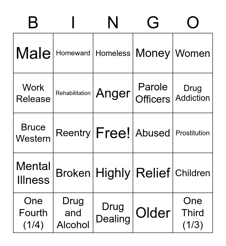 This bingo card has a free space and 29 words: One Fourth (1/4), Financial, Reentry, Poverty, Male, Homeless, Rehabilitation, Broken, Abused, Drug and Alcohol, Prostitution, One Third (1/3), Drug Dealing, Older, Drug Addiction, Big Brothers Type, Highly, Mental Illness, Women, Bruce Western, Relief, Injustice, Parole Officers, Work Release, Money, Homeward, Children, Anger and Life.