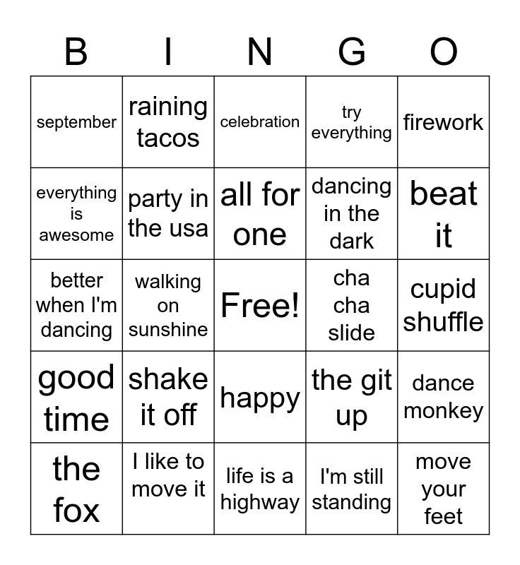 This bingo card has a free space and 40 words: cant stop the feeling, better when I'm dancing, do you like waffles, party in the usa, I like to move it, happy, all for one, on top of the world, firework, good time, walking on sunshine, try everything, move your feet, cupid shuffle, cha cha slide, shake it off, roar, september, we got the beat, celebration, dance monkey, I'm still standing, dancing in the dark, everything is awesome, let it go, hot wings, hampster dance, centuries, macarena, lets get loud, timber, the fox, love is an open door, the git up, beat it, life is a highway, we will rock you, the greatest, raining tacos and just sing.