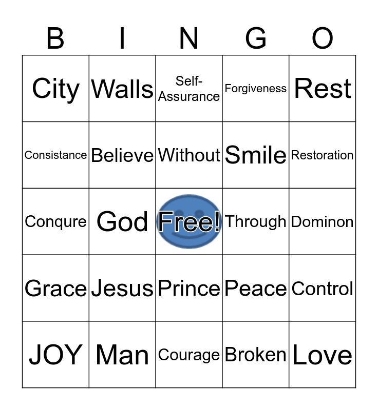 This bingo card has a free space and 24 words: Jesus, Man, Without, JOY, Rest, City, Consistance, Walls, Through, Prince, Smile, Conqure, Peace, Control, Believe, Broken, Dominon, Self-Assurance, Restoration, God, Love, Grace, Forgiveness and Courage.