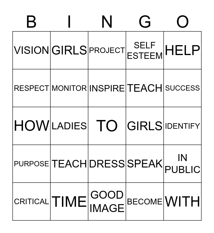 This bingo card has a free space and 24 words: TEACH, TIME, INSPIRE, CRITICAL, HELP, VISION, RESPECT, GIRLS, GIRLS, DRESS, TEACH, HOW, SPEAK, IN PUBLIC, MONITOR, BECOME, IDENTIFY, PROJECT, SUCCESS, LADIES, WITH, PURPOSE, SELF ESTEEM and GOOD IMAGE.