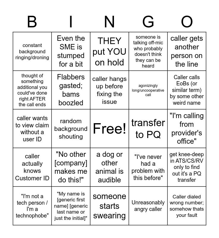 This bingo card has a free space and 32 words: Unreasonably angry caller, horrific audio quality, random background shouting, caller fixes their own problem, caller actually knows Customer ID, Flabbers gasted; bams boozled, caller gets another person on the line, get knee-deep in ATS/CS/RV only to find out it's a PQ transfer, Even the SME is stumped for a bit, call accidentally or randomly drops, caller hangs up before fixing the issue, THEY put YOU on hold, Security questions failed, they ask US to call the payer (or anyone really), transfer to PQ, "Wait aren't you [insert payer]?!", "I'm not a tech person / I'm a technophobe", caller wants to view claim without a user ID, a dog or other animal is audible, "No other [company] makes me do this!", "I've never had a problem with this before", "I've been doing this for [number] years with no issues", "I'm calling from provider's office", "My name is [generic first name] [generic last name or just the initial]", Caller dialed wrong number; somehow thats your fault, someone is talking off-mic who probably doesn't think they can be heard, agonizingly long/uncooperative call, thought of something additional you could've done right AFTER the call ends, constant background ringing/droning, someone starts swearing, off-topic rambling and Caller calls EoBs (or similar term) by some other weird name.