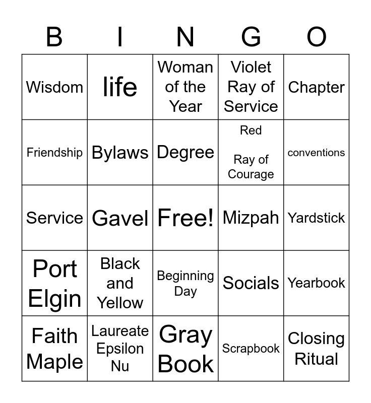 This bingo card has a free space and 40 words: Programs, Service, Master, Bylaws, Laureate Epsilon Nu, Beginning Day, Degree, yellow Rose, Chapter, Port Elgin, Gavel, Violet Ray of Service, Closing Ritual, Yardstick, Mizpah, Black and Yellow, Pledges, Wisdom, fingertips, Woman of the Year, Yearbook, Scrapbook, Red Ray of Courage, Friendship, Legacy, Walter Ross, Ritual of Jewels, Founders Day, Sisters, birthday, Courage, Faith Maple, by-laws, Socials, conventions, Gray Book, secret sister, Learning, life and Torchbearer.