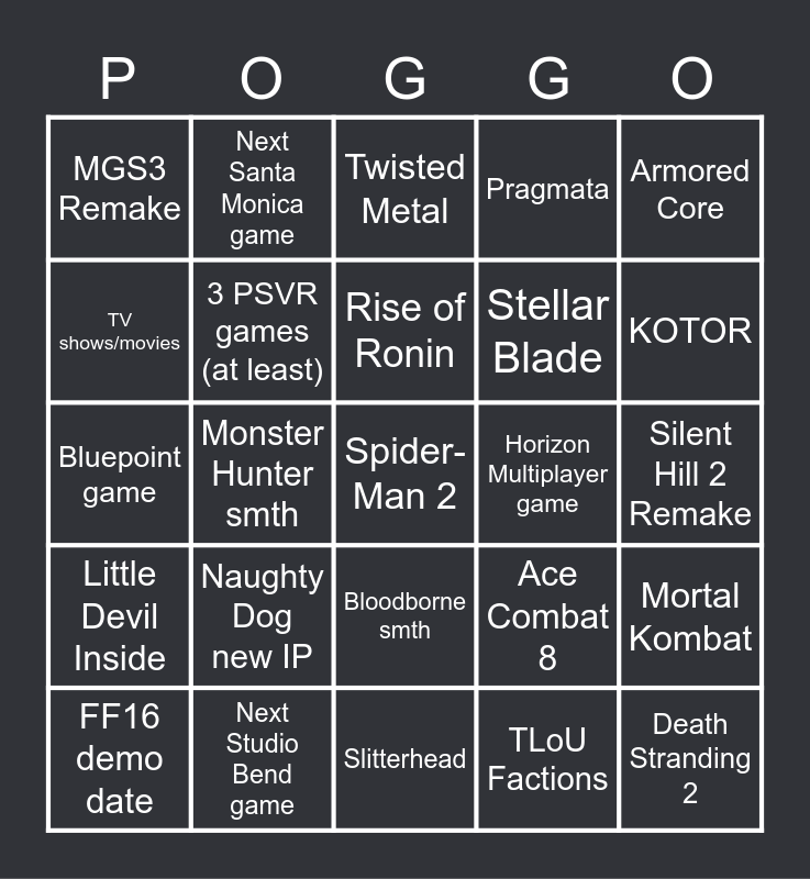 This bingo card has a free space and 24 words: Naughty Dog new IP, Next Studio Bend game, Rise of Ronin, FF16 demo date, Armored Core, MGS3 Remake, TV shows/movies, Next Santa Monica game, Horizon Multiplayer game, Bloodborne smth, Stellar Blade, Bluepoint game, Ace Combat 8, Mortal Kombat, 3 PSVR games (at least), TLoU Factions, Silent Hill 2 Remake, Twisted Metal, KOTOR, Monster Hunter smth, Death Stranding 2, Little Devil Inside, Pragmata and Slitterhead.