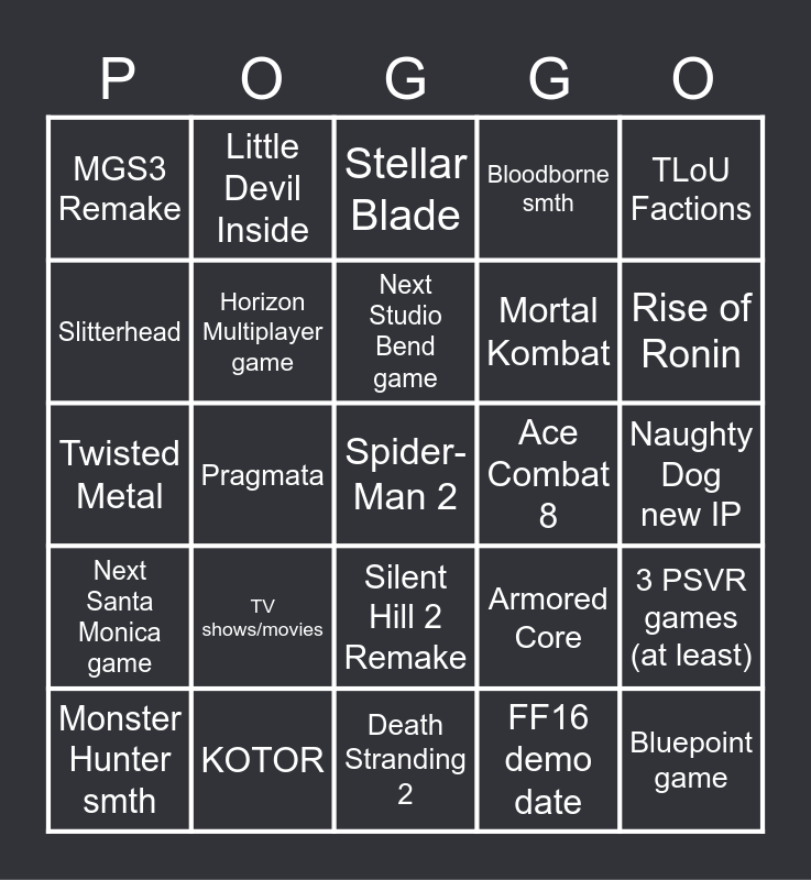 This bingo card has a free space and 24 words: TV shows/movies, KOTOR, Next Studio Bend game, Monster Hunter smth, TLoU Factions, MGS3 Remake, Slitterhead, Little Devil Inside, Ace Combat 8, Silent Hill 2 Remake, Mortal Kombat, Twisted Metal, Armored Core, 3 PSVR games (at least), Horizon Multiplayer game, FF16 demo date, Naughty Dog new IP, Stellar Blade, Rise of Ronin, Pragmata, Bluepoint game, Next Santa Monica game, Bloodborne smth and Death Stranding 2.