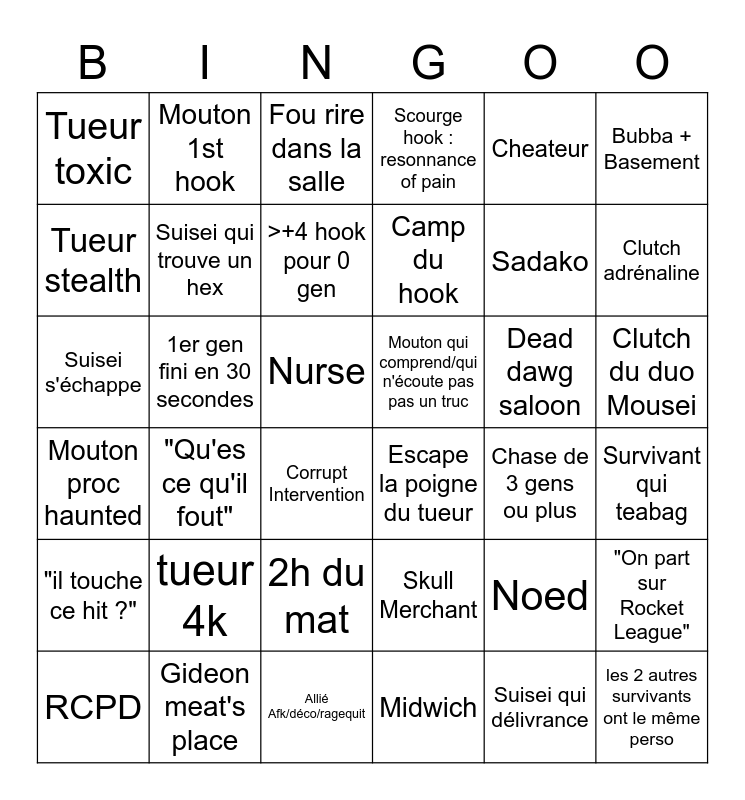 This bingo card has 36 words: Skull Merchant, 2h du mat, Midwich, Tueur stealth, Mouton proc haunted, Mouton qui comprend/qui n'écoute pas pas un truc, Suisei qui trouve un hex, Allié Afk/déco/ragequit, Cheateur, Noed, Clutch adrénaline, Scourge hook : resonnance of pain, "On part sur Rocket League", 1er gen fini en 30 secondes, Camp du hook, Tueur toxic, "il touche ce hit ?", Dead dawg saloon, Suisei s'échappe, Fou rire dans la salle, Nurse, "Qu'es ce qu'il fout", Escape la poigne du tueur, Corrupt Intervention, Chase de 3 gens ou plus, Mouton 1st hook, Sadako, Gideon meat's place, >+4 hook pour 0 gen, Bubba + Basement, les 2 autres survivants ont le même perso, RCPD, Survivant qui teabag, Clutch du duo Mousei, tueur 4k and Suisei qui délivrance.