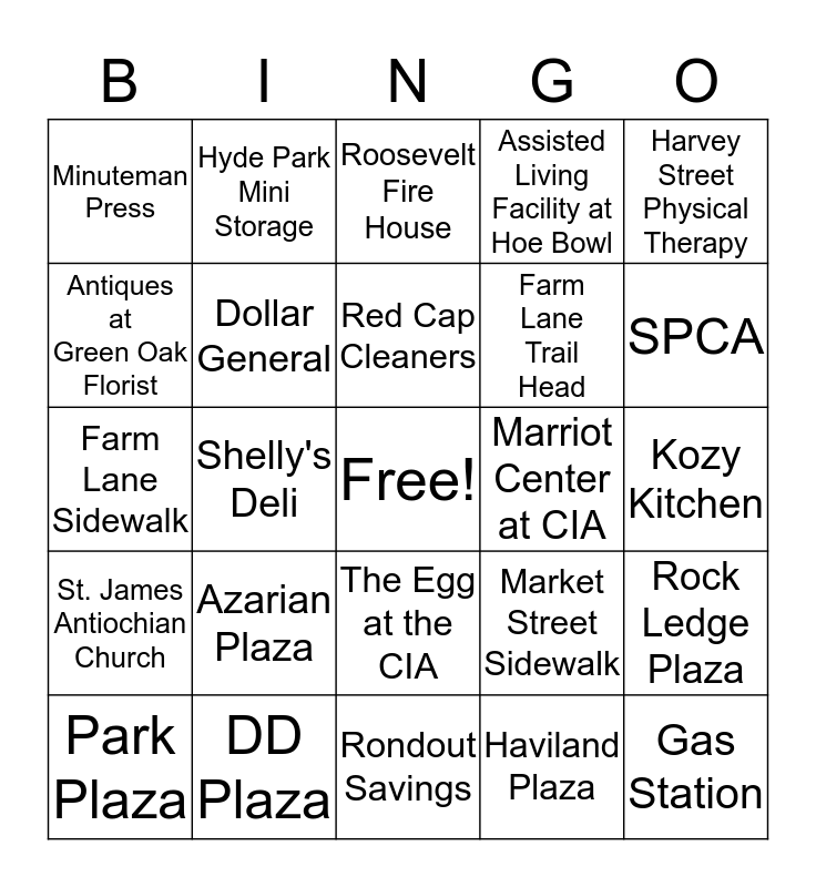 This bingo card has a free space and 24 words: Azarian Plaza, DD Plaza, Red Cap Cleaners, Park Plaza, Harvey Street Physical Therapy, Minuteman Press, Antiques at Green Oak Florist, Hyde Park Mini Storage, Marriot Center at CIA, The Egg at the CIA, Farm Lane Trail Head, Farm Lane Sidewalk, Market Street Sidewalk, Rock Ledge Plaza, Dollar General, Haviland Plaza, Kozy Kitchen, Roosevelt Fire House, SPCA, Shelly's Deli, Gas Station, St. James Antiochian Church, Assisted Living Facility at Hoe Bowl and Rondout Savings.