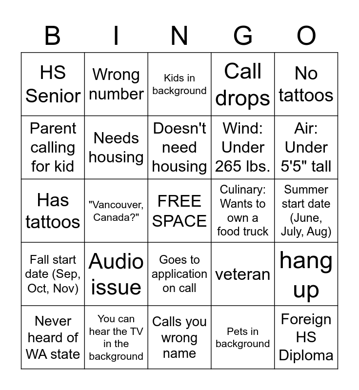 This bingo card has a free space and 25 words: Audio issue, Calls you wrong name, Doesn't need housing, Never heard of WA state, No tattoos, HS Senior, Parent calling for kid, Wrong number, Culinary: Wants to own a food truck, Goes to application on call, Wind: Under 265 lbs., Has tattoos, veteran, hang up, Needs housing, "Where is Portland?", Summer start date (June, July, Aug), Kids in background, Air: Under 5'5" tall, "Vancouver, Canada?", Foreign HS Diploma, You can hear the TV in the background, Fall start date (Sep, Oct, Nov), Call drops and Pets in background.