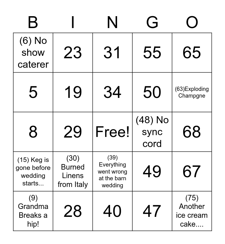 This bingo card has a free space and 75 words: 1, 16, 31, 46, 61, 2, 17, 32, 47, 62, (3) Wind-blown Dj planner, (18) Ran out of Roast Beef, (48) No sync cord, (63)Exploding Champgne, 4, 19, (33) Wrong Bakery order delivered, 49, 64, 5, 20, 34, 50, 65, (6) No show caterer, (21) Stolen Blender, 35, (51) Black Lasagna, (66) Up and down chairs, 7, 22, (36) DJ bothers couple with technical difficulties, 52, 67, 8, 23, 37, 53, 68, (9) Grandma Breaks a hip!, (24) $3000 Japanese Whiskey, 38, (54) Missing Bubble Machine, (69) Missing Permits, Flat Tires and sick staff, 10, 25, (39) Everything went wrong at the barn wedding, 55, 70, 11, 26, 40, 56, 71, (12) Venue Sold 1 week from Wedding Date!, (27) 700 Box Lunches!, 41, (57) Box Lunch Breakdown, (72)Staff "drives themselves" to a cater, 13, 28, (42) We served the kids champagne!, 58, 73, 14, 29, 43, 59, 74, (15) Keg is gone before wedding starts..., (30) Burned Linens from Italy, 44, (60) So much food, (75) Another ice cream cake.... and (45) No ingredients for the salad.