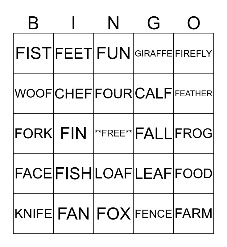 This bingo card has a free space and 24 words: FISH, FAN, FOUR, KNIFE, FIREFLY, FIST, WOOF, FEET, FALL, LOAF, CALF, FORK, LEAF, FOOD, CHEF, FENCE, FROG, FUN, FEATHER, FIN, FARM, FACE, GIRAFFE and FOX.