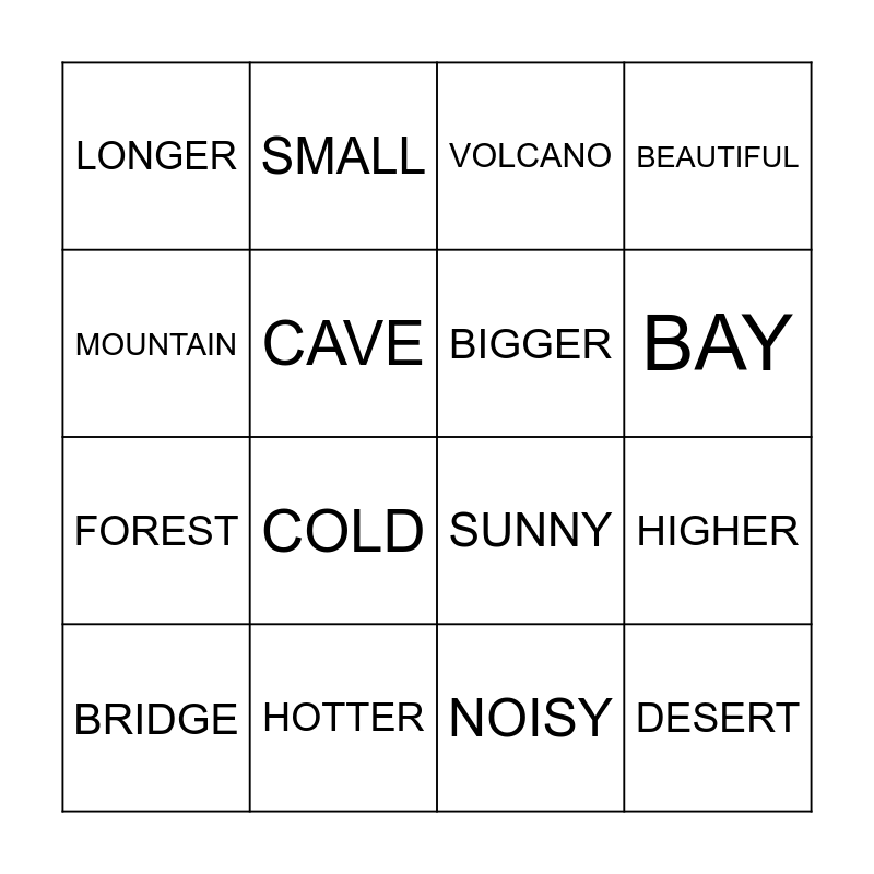 This bingo card has 30 words: SWAMP, ISLAND, HIGHER, OCEAN, LONGER, VOLCANO, BIGGER, LAKE, HOTTER, TOWN, NOISY, BRIDGE, CLEAN, RIVER, COLD, WATERFALL, QUIET, DESERT, WINDY, MOUNTAIN, SUNNY, PATH, SMALL, FOREST, CAVE, BEAUTIFUL, CLIFF, TALL, BAY and SWAMP.