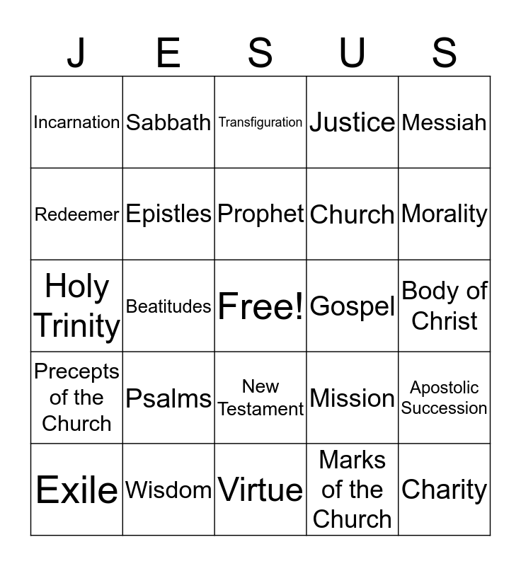 This bingo card has a free space and 24 words: Psalms, Wisdom, Prophet, Exile, Messiah, Incarnation, Redeemer, Sabbath, Gospel, New Testament, Church, Holy Trinity, Mission, Apostolic Succession, Epistles, Marks of the Church, Body of Christ, Transfiguration, Morality, Beatitudes, Charity, Precepts of the Church, Justice and Virtue.
