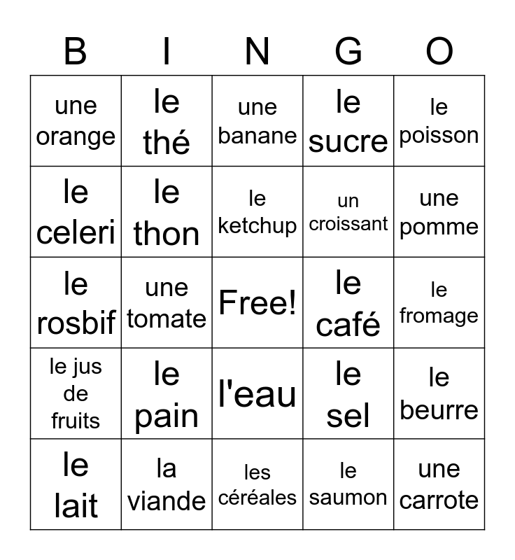 This bingo card has a free space and 24 words: le pain, la viande, le ketchup, le lait, le poisson, une orange, le celeri, le thé, le café, l'eau, un croissant, le rosbif, le sel, le beurre, le thon, le saumon, le fromage, une banane, une pomme, une tomate, une carrote, le jus de fruits, le sucre and les céréales.