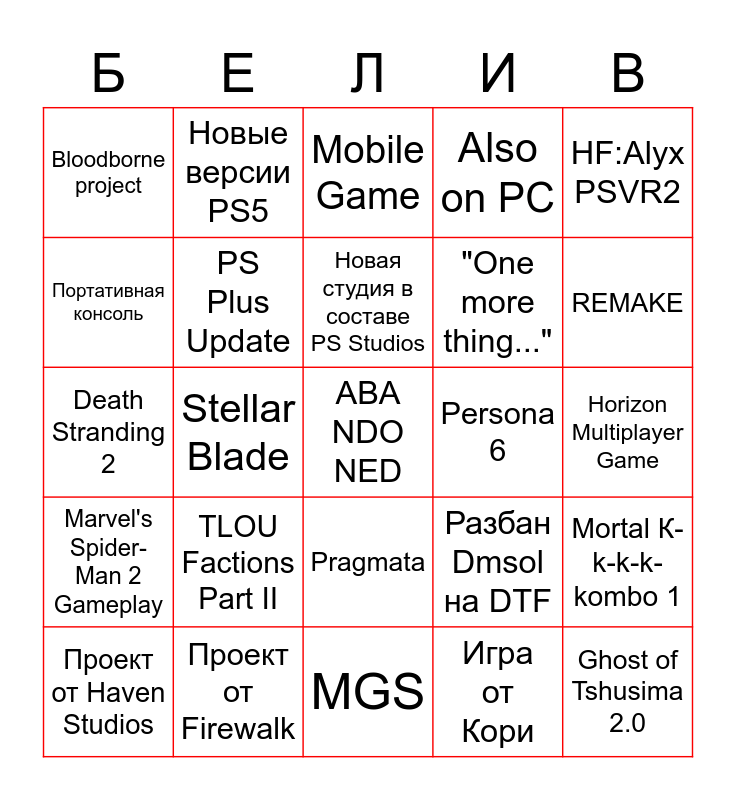 This bingo card has 25 words: TLOU Factions Part II, MGS, Новая студия в составе PS Studios, Проект от Haven Studios, HF:Alyx PSVR2, Bloodborne project, Портативная консоль, Новые версии PS5, Persona 6, Pragmata, "One more thing...", Death Stranding 2, Разбан Dmsol на DTF, Mortal К-k-k-k-kombo 1, PS Plus Update, Ghost of Tshusima 2.0, Horizon Multiplayer Game, Mobile Game, REMAKE, Stellar Blade, ABA NDO NED, Проект от Firewalk, Marvel's Spider-Man 2 Gameplay, Also on PC and Игра от Кори.