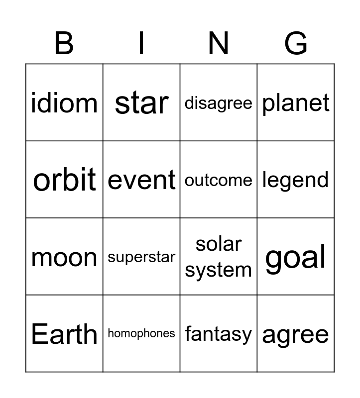 This bingo card has 18 words: superstar, agree, disagree, idiom, solar system, planet, Earth, star, legend, moon, fantasy, orbit, goal, event, outcome, solar eclipse, homophones and multiple meaning words.