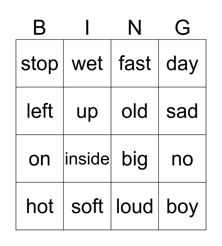 This bingo card has a free space and 15 words: hot, boy, fast, stop, sad, left, inside, loud, up, on, no, day, old, wet and soft.