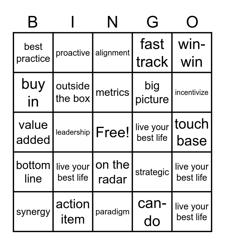 This bingo card has a free space and 24 words: live your best life, action item, metrics, synergy, win-win, best practice, buy in, proactive, live your best life, on the radar, big picture, value added, strategic, live your best life, outside the box, can-do, touch base, alignment, incentivize, leadership, live your best life, bottom line, fast track and paradigm.