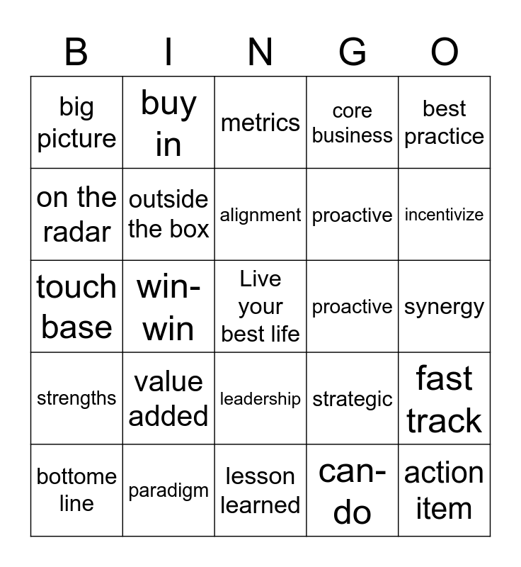 This bingo card has a free space and 24 words: value added, paradigm, alignment, bottome line, best practice, big picture, on the radar, buy in, proactive, leadership, proactive, touch base, strategic, fast track, outside the box, can-do, synergy, metrics, incentivize, win-win, action item, strengths, core business and lesson learned.