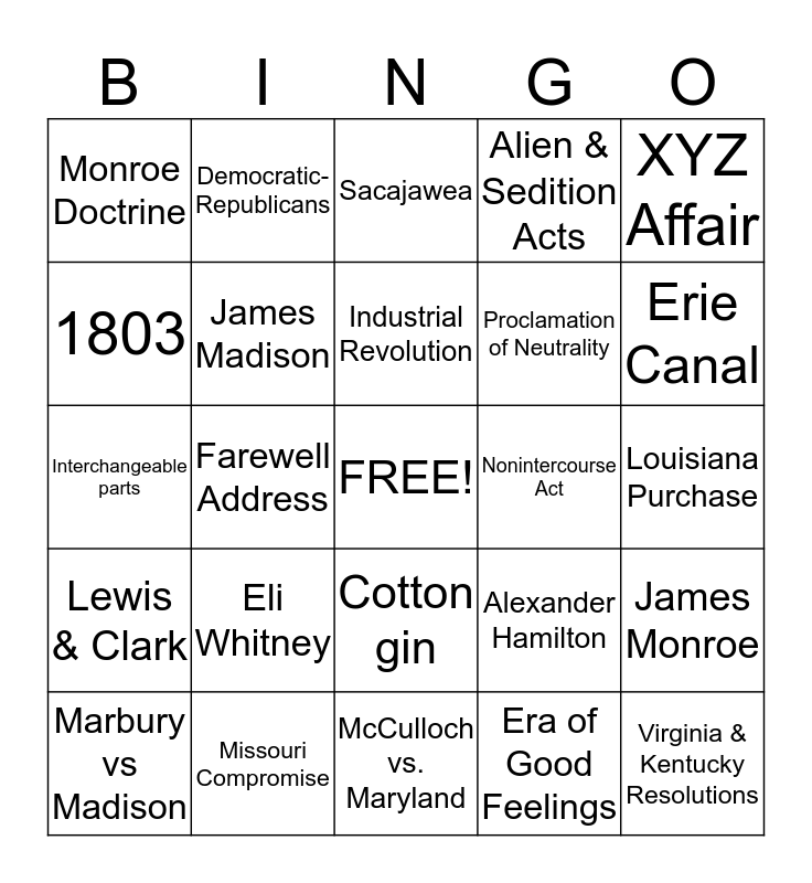 This bingo card has a free space and 38 words: George Washington, John Adams, Thomas Jefferson, James Madison, James Monroe, Eli Whitney, Industrial Revolution, Whiskey Rebellion, XYZ Affair, Proclamation of Neutrality, Farewell Address, Alien & Sedition Acts, Virginia & Kentucky Resolutions, Louisiana Purchase, 1803, Lewis & Clark, War of 1812, Sacajawea, Embargo Act of 1807, Nonintercourse Act, Monroe Doctrine, Missouri Compromise, Erie Canal, Marbury vs Madison, Gibbons vs. Ogden, McCulloch vs. Maryland, John Marshall, Henry Clay, Impressment, Adams-Onis Treaty, Steamboat, Cotton gin, Era of Good Feelings, Democratic-Republicans, Federalists, Alexander Hamilton, Interchangeable parts and Urbanization.