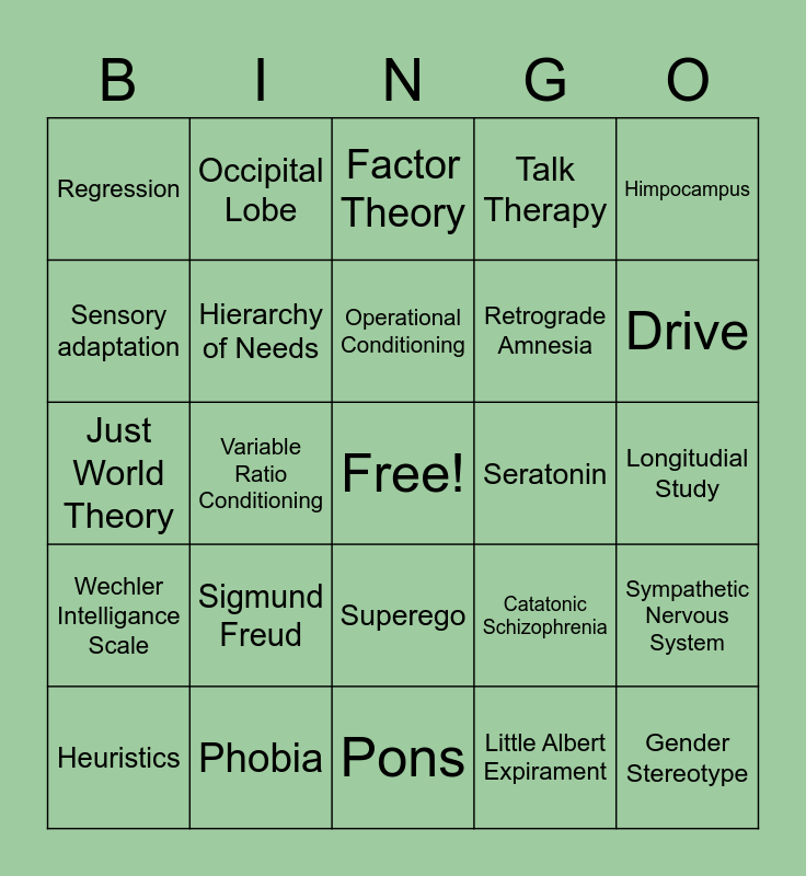 This bingo card has a free space and 24 words: Sigmund Freud, Phobia, Operational Conditioning, Heuristics, Himpocampus, Regression, Sensory adaptation, Occipital Lobe, Seratonin, Superego, Retrograde Amnesia, Just World Theory, Catatonic Schizophrenia, Sympathetic Nervous System, Hierarchy of Needs, Little Albert Expirament, Longitudial Study, Factor Theory, Drive, Variable Ratio Conditioning, Gender Stereotype, Wechler Intelligance Scale, Talk Therapy and Pons.