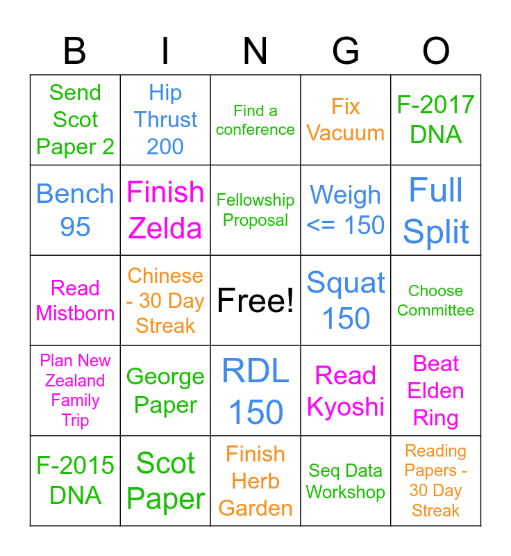 This bingo card has a free space and 24 words: George Paper, Scot Paper, Fellowship Proposal, F-2015 DNA, F-2017 DNA, Send Scot Paper 2, Bench 95, Hip Thrust 200, Squat 150, RDL 150, Weigh <= 150, Read Mistborn, Read Kyoshi, Beat Elden Ring, Finish Zelda, Seq Data Workshop, Choose Committee, Find a conference, Full Split, Chinese - 30 Day Streak, Reading Papers - 30 Day Streak, Plan New Zealand Family Trip, Fix Vacuum and Finish Herb Garden.