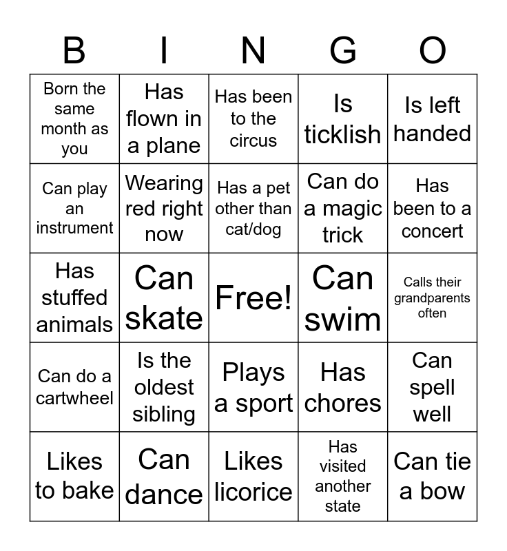This bingo card has a free space and 24 words: Is the oldest sibling, Can dance, Has a pet other than cat/dog, Likes to bake, Is left handed, Born the same month as you, Can play an instrument, Has flown in a plane, Can swim, Plays a sport, Can do a magic trick, Has stuffed animals, Has chores, Can spell well, Wearing red right now, Has visited another state, Calls their grandparents often, Has been to the circus, Has been to a concert, Can skate, Can tie a bow, Can do a cartwheel, Is ticklish and Likes licorice.