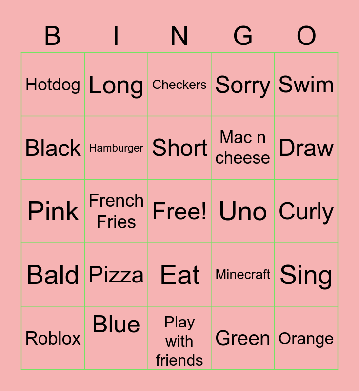This bingo card has a free space and 24 words: Pizza, Blue, Short, Roblox, Swim, Hotdog, Black, Long, Uno, Eat, Mac n cheese, Pink, Minecraft, Sing, Hamburger, Green, Curly, Checkers, Draw, French Fries, Orange, Bald, Sorry and Play with friends.
