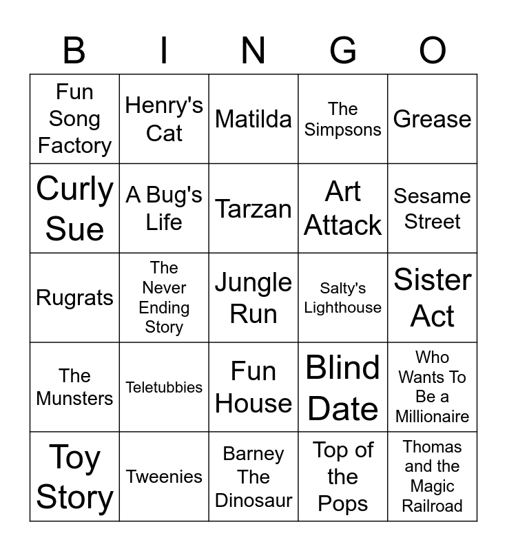 This bingo card has a free space and 24 words: Teletubbies, Tweenies, Tarzan, Toy Story, Grease, Fun Song Factory, Curly Sue, Henry's Cat, Salty's Lighthouse, Fun House, Art Attack, Rugrats, Blind Date, Who Wants To Be a Millionaire, A Bug's Life, Top of the Pops, Sister Act, Matilda, Sesame Street, The Never Ending Story, Thomas and the Magic Railroad, The Munsters, The Simpsons and Barney The Dinosaur.