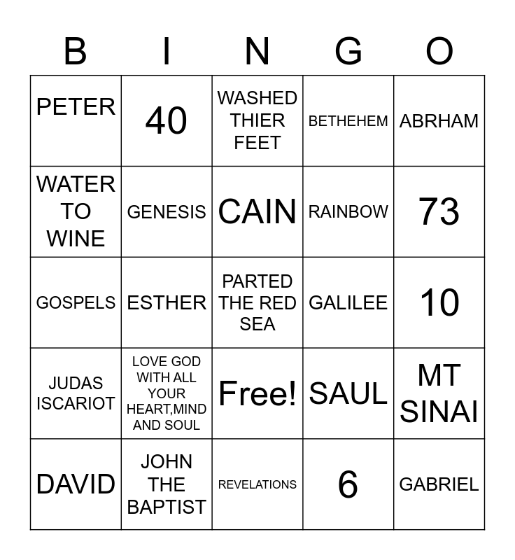 This bingo card has a free space and 26 words: Free!, 6, CAIN, JOHN THE BAPTIST, ABRHAM, PETER, WATER TO WINE, 40, 10, SAUL, RAINBOW, GOSPELS, MT SINAI, DAVID, ESTHER, JESUS, BETHEHEM, JUDAS ISCARIOT, WASHED THIER FEET, GABRIEL, 73, REVELATIONS, GALILEE, LOVE GOD WITH ALL YOUR HEART,MIND AND SOUL, GENESIS and GABIEL.