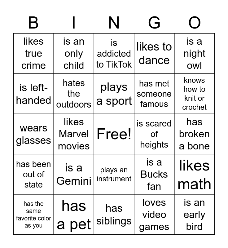 This bingo card has a free space and 24 words: is a Gemini, has a pet, plays a sport, has the same favorite color as you, is a night owl, likes true crime, is left-handed, is an only child, is scared of heights, plays an instrument, has met someone famous, wears glasses, is a Bucks fan, likes math, hates the outdoors, loves video games, has broken a bone, is addicted to TikTok, knows how to knit or crochet, likes Marvel movies, is an early bird, has been out of state, likes to dance and has siblings.