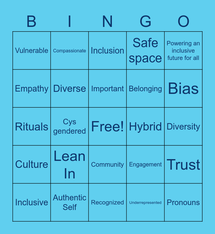 This bingo card has a free space and 24 words: Lean In, Authentic Self, Important, Inclusive, Powering an inclusive future for all, Vulnerable, Empathy, Compassionate, Hybrid, Community, Belonging, Rituals, Engagement, Trust, Diverse, Underrepresented, Diversity, Inclusion, Bias, Cys gendered, Pronouns, Culture, Safe space and Recognized.