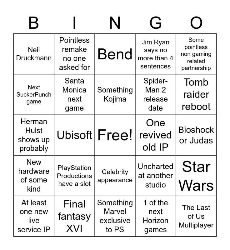 This bingo card has a free space and 24 words: PlayStation Productions have a slot, Final fantasy XVI, Something Kojima, At least one new live service IP, Some pointless non gaming related partnership, Neil Druckmann, Next SuckerPunch game, Pointless remake no one asked for, One revived old IP, Celebrity appearance, Spider-Man 2 release date, Herman Hulst shows up probably, Uncharted at another studio, Star Wars, Santa Monica next game, 1 of the next Horizon games, Bioshock or Judas, Bend, Tomb raider reboot, Ubisoft, The Last of Us Multiplayer, New hardware of some kind, Jim Ryan says no more than 4 sentences and Something Marvel exclusive to PS.