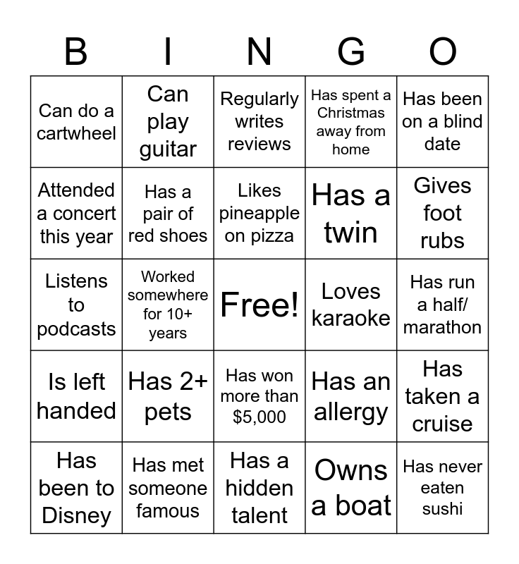 This bingo card has a free space and 24 words: Has 2+ pets, Has met someone famous, Likes pineapple on pizza, Has been to Disney, Has been on a blind date, Can do a cartwheel, Attended a concert this year, Can play guitar, Loves karaoke, Has won more than $5,000, Has a twin, Listens to podcasts, Has an allergy, Has taken a cruise, Has a pair of red shoes, Owns a boat, Has run a half/ marathon, Regularly writes reviews, Gives foot rubs, Worked somewhere for 10+ years, Has never eaten sushi, Is left handed, Has spent a Christmas away from home and Has a hidden talent.
