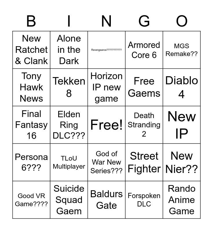 This bingo card has a free space and 40 words: More Spider Man 2, Final Fantasy 16, Final Fantasy Ew 2, Tekken 8, Suicide Squad Gaem, God of War New Series???, Horizon IP new game, Bloodborne Remake???, MGS Remake??, Persona 6???, Elden Ring DLC???, Armored Core 6, Rando Anime Game, New IP, Death Stranding 2, TLoU Multiplayer, Mortal Kombat 1??, New Ratchet & Clank, Crash Bandicoot new game??, Revengeance???????????, New Nier??, Forspoken DLC, Free Gaems, Tony Hawk News, Cringe, Farming Sim, No Info Announcement, Silent Hill News, Star Wars Not Eclipse, Star Wars Eclipse, Shitty VR Game, Good VR Game????, Non-spiderman Marvel, Street Fighter, Diablo 4, Baldurs Gate, Shitty ARPG, Alan Wake 2, Alone in the Dark and GTA6???.