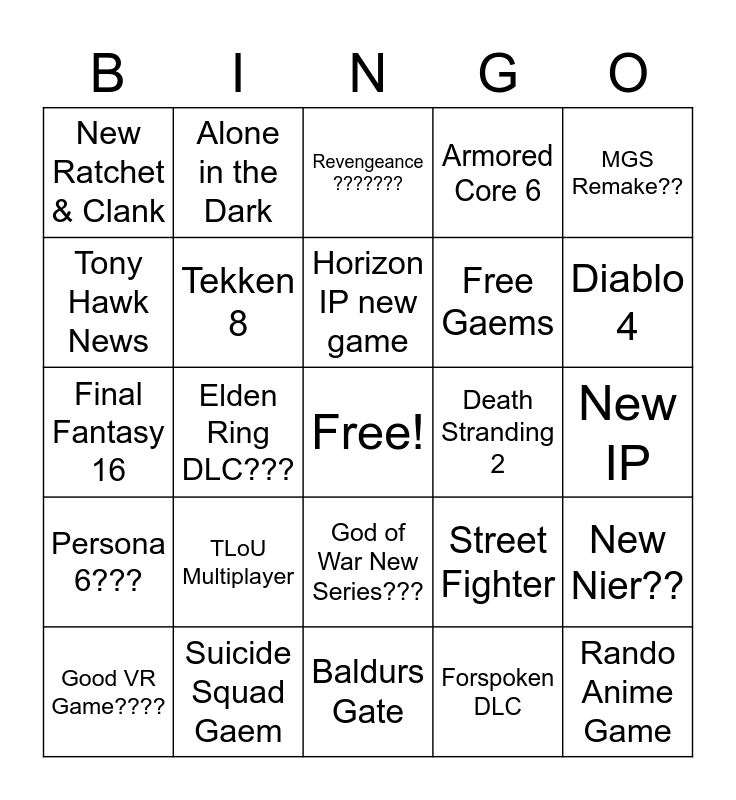 This bingo card has a free space and 40 words: More Spider Man 2, Final Fantasy 16, Final Fantasy Ew 2, Tekken 8, Suicide Squad Gaem, God of War New Series???, Horizon IP new game, Bloodborne Remake???, MGS Remake??, Persona 6???, Elden Ring DLC???, Armored Core 6, Rando Anime Game, New IP, Death Stranding 2, TLoU Multiplayer, Mortal Kombat 1??, New Ratchet & Clank, Crash Bandicoot new game??, Revengeance ???????, New Nier??, Forspoken DLC, Free Gaems, Tony Hawk News, Cringe, Farming Sim, No Info Announcement, Silent Hill News, Star Wars Not Eclipse, Star Wars Eclipse, Shitty VR Game, Good VR Game????, Non-spiderman Marvel, Street Fighter, Diablo 4, Baldurs Gate, Shitty ARPG, Alan Wake 2, Alone in the Dark and GTA6???.