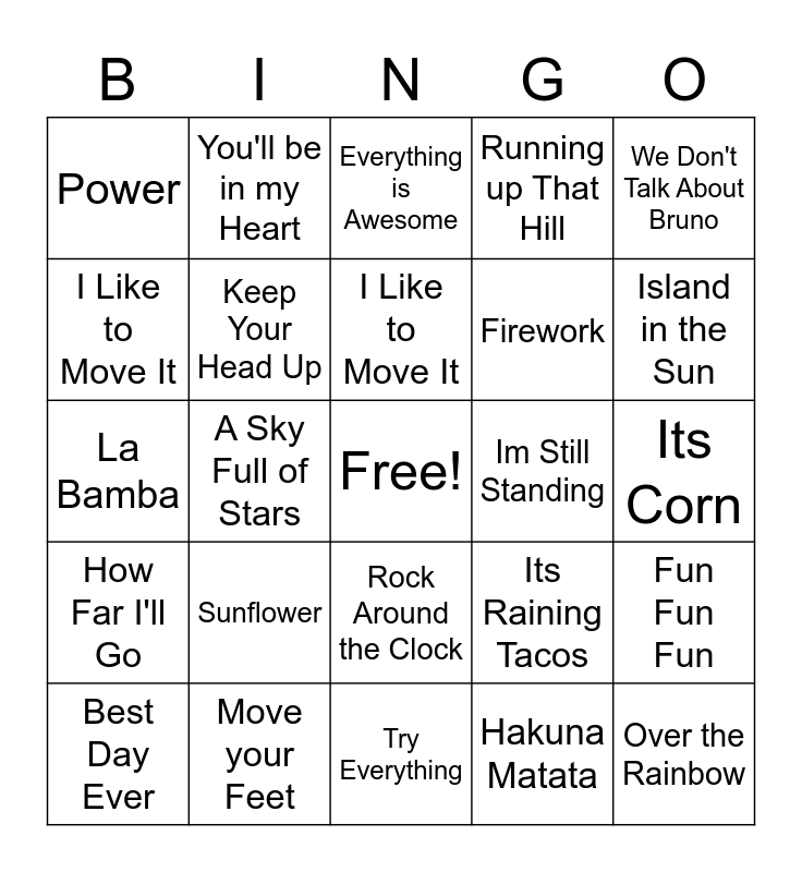 This bingo card has a free space and 28 words: Fun Fun Fun, In Summer, Firework, Hakuna Matata, I Like to Move It, Everything is Awesome, You'll be in my Heart, How Far I'll Go, Im Still Standing, Best Day Ever, La Bamba, Running up That Hill, Move your Feet, Try Everything, Island in the Sun, Under the Sea, Sunflower, Keep Your Head Up, I Like to Move It, Rock Around the Clock, Power, I Aint Worried, Over the Rainbow, A Sky Full of Stars, Its Corn, Its Raining Tacos, We Don't Talk About Bruno and Soak Up the Sun.