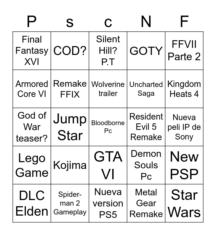 This bingo card has a free space and 24 words: Kojima, Spider-man 2 Gameplay, Wolverine trailer, DLC Elden, FFVII Parte 2, Final Fantasy XVI, Armored Core VI, COD?, Resident Evil 5 Remake, GTA VI, Uncharted Saga, God of War teaser?, Demon Souls Pc, New PSP, Remake FFIX, Metal Gear Remake, Nueva peli IP de Sony, Silent Hill? P.T, Kingdom Heats 4, Jump Star, Star Wars, Lego Game, GOTY and Nueva version PS5.